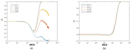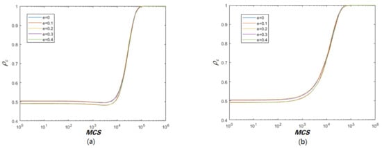Figure 5a is the evolutionary graph of the proportion of individuals who take cooperative behavior in the group before the introduction of information infiltration mechanism in the improved evolutionary game model with changeable link weight. It can be seen that when the link weight distribution interval is small, rewarding individual cooperative behavior by enhancing reputation has lost its effect, and each individual strives for the maximum direct benefit in the interaction with their neighbors, so it finally tends to the stable state of total defection. With the increase in e, the distribution of the link weight is more scattered, and individuals in the group pay more and more attention to reputation reward. Increasing the reputation reward for cooperative behavior can improve the proportion of cooperative behavior when the group reaches the evolutionary steady-state.