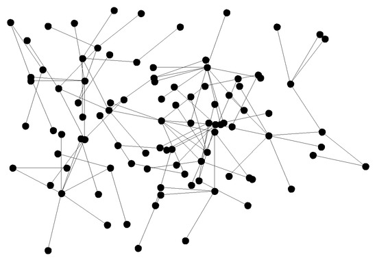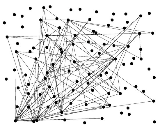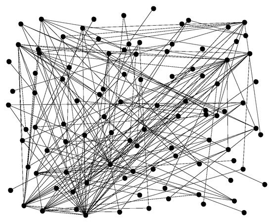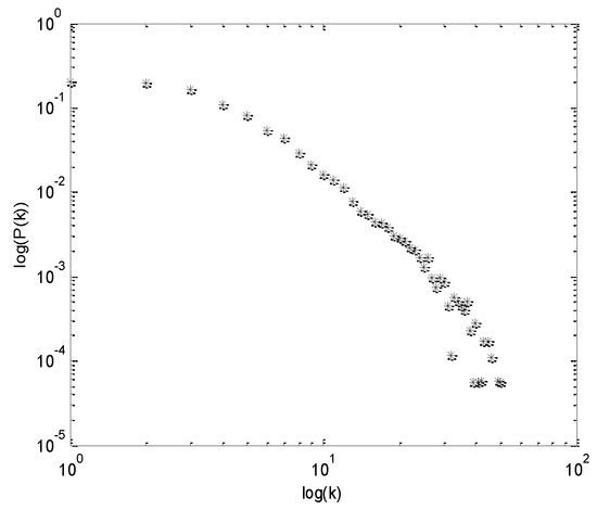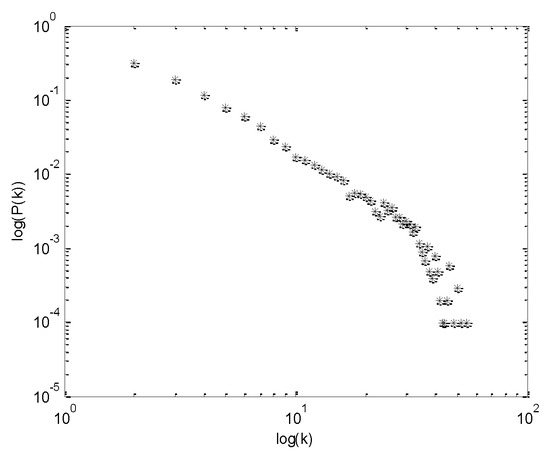 The parameter values for Case 3 are and . These values do not satisfy the condition that the network degree distribution obey the power law, which is , i.e., . Through theoretical analysis, we observe that the SCTN does not obey the power law distribution. The simulation results for Case 3 are shown in Figure 5 and Figure 6. It can be seen from Figure 5 that the network does not clearly reflect scale-free characteristics, and the scatter points in Figure 6 also do not effectively fit a slanted straight line in the logarithmic coordinates. Therefore, the degree of SCTN formed under the evolution mechanism of Case 3 does not obey the power law distribution.