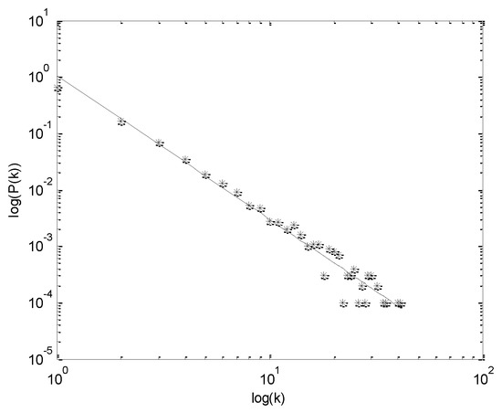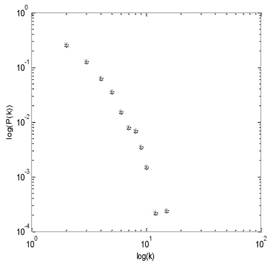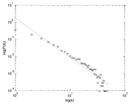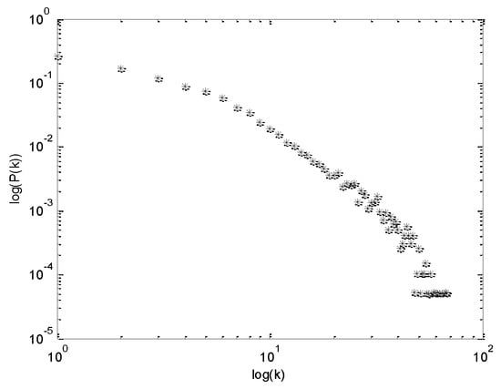 The parameters for Case 2: and satisfy the condition of the power degree distribution of the network degree distribution, which is . The simulation results for Case 2 are shown in Figure 3 and Figure 4. It is obvious from Figure 3 that the SCTNs presents scale-free characteristics. The scatter on the graph effectively fits the straight line in the graph. Figure 4 further proves that the degree of SCTN obeys the power law distribution under the evolution mechanism. The formula for the fitted straight line is , which is the degree distribution expression. The power law index for Case 2 is 2.3, which is approximately equal to the value obtained by the power law index formula, i.e., 7.3. Therefore, we can conclude that Test 2 effectively simulates the evolution process of the SCTN.