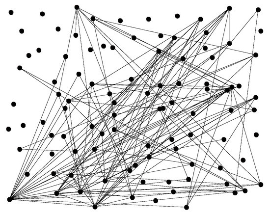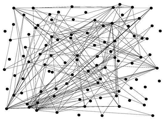The simulation results for Case 4 are shown in Figure 7, Figure 8, Figure 9, Figure 10, Figure 11 and Figure 12. Figure 7, Figure 9 and Figure 11 correspond to the structure diagram of the SCTN at the 100th, 200th, and 300th time steps, respectively. Similarly, Figure 8, Figure 10 and Figure 12 correspond to the degree distribution map of the SCTN at the 100th, 200th, and 300th time steps, respectively. We can see that there are many points in Figure 7 that have not yet joined the network. In Figure 9, most of the unconnected nodes are added to the network, and the number of connections has also increased. However, in Figure 11, the number of nodes exiting the network has increased.