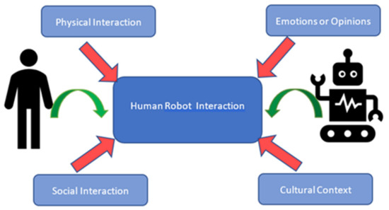 Robots can interact with humans by several means. Figure 1 illustrates the human-robot interaction. There are different types of interactions, such as physical, social emotions, or cultural context interactions. There are different techniques through which a human can interact with the robots, such as visual, tactile screen sensing, tactile skin sensing, voice, and audiovisual [8].