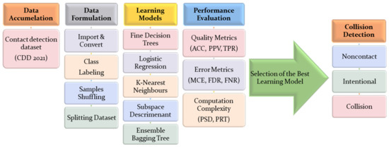 In this research, we have developed and evaluated our proposed machine learning-based human-robot contact detection using the MATLAB 2021b system along with Simulink toolboxes over a 64-bit Windows 11 Professional operating system, with the latest service packs. For improved simulation and efficient experimental assessment, we used a high-performance computing platform that employs an Intel 11th Gen Intel (R) Core (TM) i7-11800 H @ 2.30 GHz Processor, with 16 GB memory (DDR-4 RAM units), 1000-GB SD storage, and 4 GB graphical processing unit (GPU). The complete workflow diagram for the development and assessment of our proposed HRCDS is illustrated in Figure 2 below. Specifically, once the required data are accumulated, then, the HRCDM model is composed of three core components before the deployment and performance of the collision detection; these include the data formulation component, learning models’ component, and the performance evaluation component.