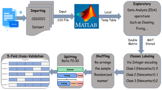 - The first stage after accumulation of the intended data (i.e., CCD2021) is to read and host the CCD2021 records (which is available in .CSV format) using the MATLAB import tool. Once imported, MATLAB will host the data records in a temporary table in order to enable the exploratory data analysis (EDA) before the data are stored in the workplace to check the symmetry of samples features. At this stage, we have performed several EDA processes over the imported data including: (1) combining the datasets from different files in one unified dataset, (2) removing any unwanted or corrupted values, (3) fixing all missing values, (4) replacing nonimportable values or empty cells with zeros.
