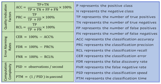 The model evaluation in the machine-learning-based model is a vital stage of every model design [49]. This significantly requires tracing of the performance trajectories to provide insight into the solution approach and problem formulation, to compare the developed ML-based models to pick up the optimal model that maximizes the model performance and minimizes the model alarms and error thresholds, and finally to benchmark the best-obtained results with respect to those results reported in the literature within the same area of research. In this research, we have evaluated our models in terms of three quality indicating factors (ACC, PPV, and TPR), three alarms/error rates (MCE, FDR, and FNR), and two computation complexity factors (PSD and PRT). Besides, a confusion matrix analysis is provided to explore the statistical numbers of the samples classified correctly (TP, TN) and the samples classified incorrectly (FP, FN). Furthermore, the area under the ROC (receiver operating characteristic) curve (in short, known as AUC) [50] is also investigated for every individual class (noncontact, intentional, and collision). Figure 5 demonstrates the summary of standard assessment factors involved in this research.