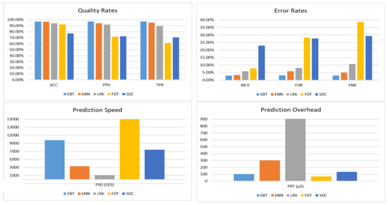 In this subsection, we present and analyze our experimental results for the developed and evaluated models. To begin, Table 2 along with Figure 6 compares the performance of HRCDS implementation utilizing various machine learning methods (i.e., HRCDS_EBT, HRCDS_kNN, HRCDS_LRK, HRCDS_FDT, and HRCDS_SDC) in terms of eight different performance indicators (i.e., ACC, PPV, TPR, MCE, FDR, FNR, PSD, and PRT). In terms of quality rates (accuracy (ACC), specificity (PPV), and sensitivity (TPR)), the ensemble learning-based model (HRCDS_EBT) exhibits the highest performance indicators with improvement factors of 0.5–20%, 1.5–23.4%, and 0.1–24.4% for ACC, PPV, and TPR, respectively, over the other implemented ML-based models. Consequently, HRCDS_EBT has recorded the lowest estimates in terms of error rates with 2.9%, 4.3%, and 4.9% for MCE, FDR, and FNR, respectively. Conversely, the lowest quality rates and thus highest error rates belong to the subspace discriminant learning-based model (HRCDS_SDC). However, it recorded relatively high-speed inferencing with a prediction time (PRT) of 135 µS. In terms of computational complexity, both HRCDS_EBT and HRCDS_FDT show the highest prediction speed with 9800 O/S and 15,000 O/S, respectively. On the contrary, the slowest predictive model is the HRCDS_LRK requiring a 909 µS for single sample inferencing. Although HRCDM_kNN is three times slower than HRCDS_EBT, it recorded a competent performance indicator, which can be a second high-performance alternative model for the HRCDM_EBT model.