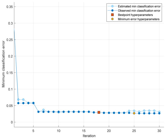 Based on the above discussion, summary, and comparisons of performance factors for HRCDS variations using different asymmetric ML techniques provided in Table 2 and Figure 6, it can be inferred that overall, the best performance factors’ results belong to the HRCDS-based ensemble bagged trees, and thus, HRCDS-EBT is efficiently selected for the robot in making intelligent decisions involving the asymmetric contacts with humans due to movements and interactions. Therefore, the following results and discussion will focus on the HRCDS-EBT. For instance, Figure 7 illustrates the trajectory of the misclassification rate (minimum classification error) for 30 iterations of the learning process of the HRCDM-EBT model. By observing the figure, the best point of the learning process is satisfied after the 18th iteration where the model reached its minimum classification error (2.9%) and was saturated to the end of the learning process. At this point, the best hyperparameters of the ensemble bagging trees were recorded (for example, the best learning rate, number of learners, etc.).