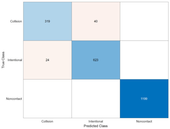 Besides, Figure 8 exhibits the confusion matrix analysis for the three-classes classifier employing ensemble bagged trees (EBT) for the HRCDS. The diagonal of the matrix represents the number of correctly classified samples for each target class; that is, the number of correctly classified samples for the “collision” class is 319 samples out of 359 samples for this target class (i.e., 88.9% of classification accuracy for this class), the number of correctly classified samples for the “intentional” class is 623 samples out of 647 samples for this target class (96.3% of classification accuracy for this class), and the number of correctly classified samples for the “Noncontact” class is 1199 samples out of 1199 samples for this target class (100% classification accuracy for this class). Conversely, the non-diagonal cells of this matrix represent the number of incorrectly classified samples for each target class; that is, the number of incorrectly classified samples for the “collision” class is 40 samples out of 359 samples for this target class (i.e., 11.1% of minimum classification error for this class), the number of incorrectly classified samples for the “intentional” class is 24 samples out of 647 samples for this target class (3.7% of minimum classification error for this class), and the number of incorrectly classified samples for the “Noncontact” class is 0 samples out of 1199 samples for this target class (0.0% minimum classification error for this class). However, the overall classification accuracy and minimum classification error will consider all numbers in the matrix as follows: