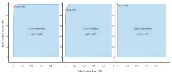 Additionally, Figure 10 illustrates the area under the ROC (receiver operating characteristic) curve (in short known as AUC) results forever individual class of the proposed three-class classifier. The AUC curve is a representational plot to present the analytical capability of the classifier model of distinguishing between the positive and negative classes. The AUC curve is created by plotting TPR against FPR to show the trade-off between sensitivity and specificity at different thresholds. For every classifier, the more its AUC curve becomes closer to the top-left corner, the better performance it has. Therefore, the best performant curve will pass through the point (0.0, 1.0) of ROC space providing a 100% ability in the discrimination of positive and negative classes (i.e., AUC = 1.0, best discrimination), whereas the closer the curve comes to the 45-degree diagonal of the ROC space, the less accurate the test is. Therefore, the least accurate curve will pass through the point (0.5, 0.5) of the ROC space providing a 50% ability in the discrimination of positive and negative classes (i.e., AUC = 0.5, no discrimination). According to the obtained ROC curves for our classes, it can be seen that all classes illustrated an excellent discrimination capability, recording AUC values of 1.00, 0.98, and 0.93 for “Noncontact”, “Intentional”, and “Collision” classes, respectively. Overall, the average AUC of the proposed model exceeds 0.97, which reflects the high capability of our model in distinguishing between the positive and negative classes.