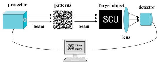 The schematic diagram of computational ghost imaging is shown in Figure 1. Random scatter patterns are generated by computational devices such as spatial light modulators, digital micromirror devices, or projectors [27,28], and different scatter patterns are converted into different light spots to interact with the target object under the irradiation of a stable laser light source. This beam, which carries information about the object, is called the signal beam, and it is detected by single-pixel camera. The other beam, which contains only the computer-generated scatter pattern information and does not contain object information, is called the reference beam. We correspond the signal beam and the reference beam one by one and calculate them using the correlation algorithm, which can reconstruct the pattern of the target object. The process can be expressed as follow,