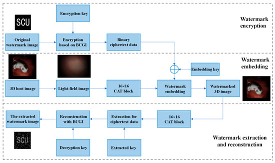 Compared with traditional 2D images, 3D images have attracted more and more attention because of their stereoscopic nature, excellent experience and ability to truly reproduce life scenes. Integral imaging (InI) is a practical light-field [2] three-dimensional imaging method; it originated from the integral photography(IP) [3] proposed by Lippmann in 1908 and has become one of the cutting-edge 3D display methods in the international arena. InI uses a microlens array (MLA) to capture a set of element images (EIs) [4]. Each element image shows an incoherent illuminated 3D scene of different perspectives. The InI system can obtain the direction and spatial information of the light ray from the scene [5] and project this information on a 2D display to produce a 3D image visible to the naked eye without any special glasses. There have been many research results on copyright protection of 2D images, and its watermarking algorithms can be implemented either by spatial domain algorithms or by frequency domain algorithms [6,7]. In 2008, a digital museum copyright protection method based on the discrete wavelet transform (DWT) was proposed in [8], where the Fresnel hologram of the watermarked image is embedded in the protected object by the discrete wavelet transform (DWT). After watermark detection, the copyright information appears in the reconstructed hologram. In [9], the authors proposed discrete cosine transform (DCT) as a method for embedding watermarks with high accuracy in extracting watermarks, and it is less affected by image compression. In [10], the authors proposed a cellular automata (CA)-based watermarking method for copyright protection of 2D images with better results than the traditional transform methods (DWT, DFT, etc.)-based watermarking techniques. In 2019, Li and Wang [11] proposed using a 3D CA filter to embed 3D watermark-converted data (QR codes) into cellular automata (CA) domains instead of 2D watermarks. This approach protects the copyright of holographic videos from malicious copying and is robust to noise and compression attacks. In 2020, Valandar et al. [12] proposed a robust watermarking scheme using different transformations (i.e., DWT, IWT and CT) and segmentation by block. In the embedding process, the image is segmented into uniform blocks and the blocks are transformed. Finally, the watermarked bits are embedded using the LL band. The method achieves significant invisibility results, but the robustness to various signal processing attacks needs to be improved. In 2021, Li and Ren [13] proposed a method for protecting the ownership of light-field images based on high-dimensional color transform (HDCT) watermarking, which outperformed existing light-field watermarking algorithms in terms of both imperceptibility and robustness. Mohamed Hamidi [14] proposed a robust hybrid watermarking method based on discrete cosine transform (DCT), discrete wavelet transform (DWT) and scale invariant feature transform (SIFT). SIFT is used to protect the watermark from geometric attacks while the watermark is embedded in the DWT-DCT domain to resist image processing operations. Medical images contain a lot of patient information and have a high demand for privacy. In [15], Wu et al. proposed a robust medical image watermarking algorithm based on contourlet transform and DCT, using contourlet transform to extract multi-scale texture information and DCT to extract feature vectors in low-frequency directional subbands. In the area of industrial image copyright protection [16], Asra Kamili et al. [17] proposed ‘DWFCAT’, a dual watermarking framework for industrial image content authentication using discrete cosine transform coefficients and exploiting their energy compression properties to achieve robust watermark embedding. At present, the research results of copyright protection for 3D images are relatively few. With the rapid development of 3D display technology based on integrated imaging [18], 3D images are increasingly being transmitted and used, and if these 3D images are not effectively protected, they can easily be illegally stolen without permission and cause losses. Therefore, the research on the copyright protection technology of 3D images is very necessary.