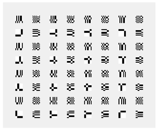 where m and n are positive integers. If the size of a given image does not satisfy Equation (11), it is processed by filling 0. According to the above assumptions, the original image is divided into B sub blocks, each of which is composed of 8 sub blocks × 8 = 64 pixels. Implement cellular automata change for each sub block (using type 8 bivariate function):