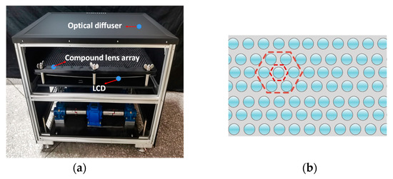 In this experiment, we used a desktop 3D display device to verify the validity of the experimental method. The device mainly consists of three parts: an optical diffuser, a composite lens array and a liquid crystal display (LCD), as shown in Figure 4a. We generate elemental image arrays (EIA) of hexagonal lens arrays from three-dimensional (3D) objects, as shown in Figure 4b. Compared with rectangular lens arrays, hexagonal lens arrays have a higher fill factor and are better for use in desktop 3D displays. The size of the optical diffuser screen is 76,804,320, so we use 76,804,320 light-field images for the experiment.