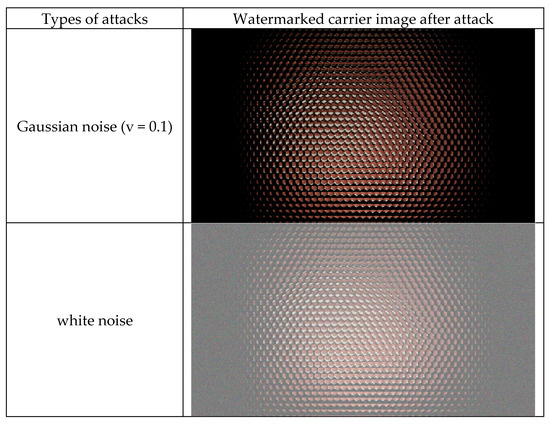 Next, we experimentally verify that the watermarking algorithm used in this paper is robust to some attacks. A practical watermarking algorithm should be robust to signal processing, usual geometric distortions and malicious attacks. A highly robust watermarking algorithm should be able to embed and extract properly after attacks such as image compression and noise addition, and the extracted watermark results should be minimally affected. As shown in Figure 7, we verify the robustness of the watermarking algorithm by adding five attacks: Gaussian noise (v = 0.1), white noise, JPEG compression (QF50), Gaussian filtering and rotation by 10°.