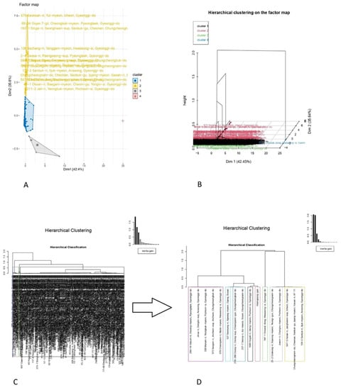 In the third step, hierarchical clustering on selected principal components was then applied. Using the “FactoMineR” package, the algorithm of the hierarchical clustering on principal components method was implemented. On the selected principal components, hierarchical clustering was computed by using the Ward criterion. The Ward criterion, which is based on multidimensional variance and is similar to principal component analysis, was implemented in the hierarchical clustering algorithm [34]. An initial partitioning was carried out through splitting the hierarchical tree. The partitioning was robustified with K-means clustering, and finally, the clusters were characterized with individuals and variables. Hierarchical clustering performs partitioning on two principles: (i) if individuals placed in the same class are close to each other (small within-class variability) and (ii) if individuals in different classes are far from each other (large between-class variability).
