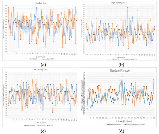 The average values in Table 8 and Table 9 indicate that the avalanche effect is significantly increased using the improved KSA PRESENT. The observations in Table 8 for the to category are for the KSA PRESENT, reduced to using the improved KSA PRESENT, indicating few values with smaller AE. Similarly, the observations for AE are for the KSA PRESENT, increased to using the improved KSA PRESENT. For all other observations, the values are close for both the KSA PRESENT and its improved variant.