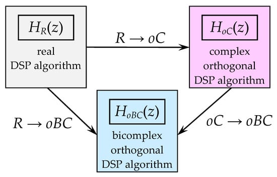 The transformation that leads to bicomplex orthogonal digital algorithms can be obtained starting from either a real (R → oBC) or a complex algorithm (oC → oBC), as shown in Figure 1. The transfer functions HR(z), HoC(z), and HoBC(z) denote real, complex, and orthogonal in regard to the vector unit i, and bicomplex orthogonal algorithms in the complex z-domain, respectively.