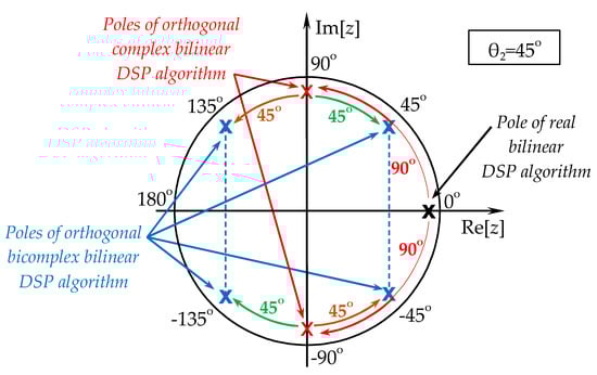 The complex–bicomplex orthogonal substitution oC → oBC (29) will again double the poles compared to the real bilinear transfer function, so that those of the bicomplex orthogonal bilinear transfer function will be four in total. As a type, these four poles will be two complex–conjugate pairs (Figure 2). Here, the rotation is as follows: each pole of the orthogonal complex DSP algorithm rotates 45° once clockwise and once counterclockwise. Thus, each pole is multiplied into two new ones belonging to the orthogonal bicomplex DSP algorithm.