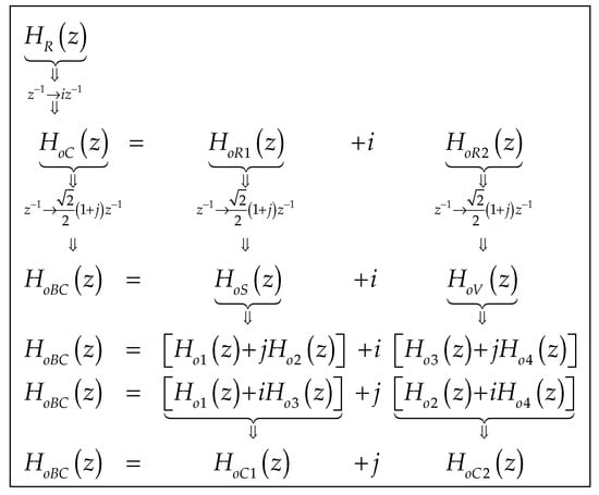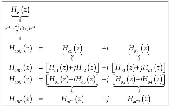 The steps to be followed to design an orthogonal bicomplex digital algorithm—represented by its transfer function HoBC(z)—when starting from a real algorithm HR(z), which is first transformed into an orthogonal complex HoC(z) algorithm, are shown in Figure 3.