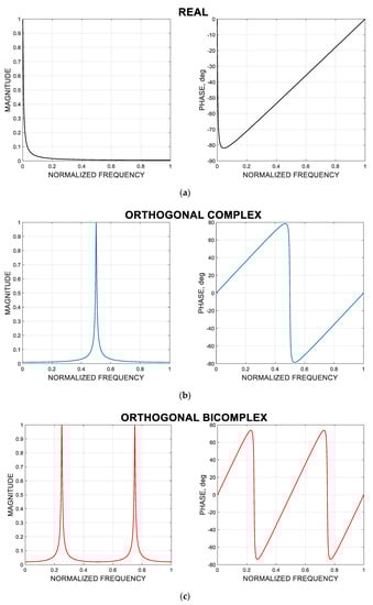 When HR(z) (32) is low-pass (LP), HoR1(z) and HoR2(z) (34) will both be of band-pass (BP) type, while the four bicomplex orthogonal transfer functions—Ho1(z), Ho2(z), Ho3(z), and Ho4(z) (37)—are also of BP type, but with two passbands each. A high-pass (HP) HR (z) will produce both BP and band-stop (BS) transfer functions (34), and in the bicomplex case the transfer functions (37) will again be multiband, having two passbands for the BP type and two stopbands for the BS type.