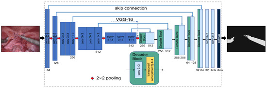 U-Net is a fully convolutional network with a symmetric encoder–decoder structure. This encoder–decoder structure of U-Net containing skip connections is able to fuse features from different layers to obtain accurate pixel-level localization with excellent segmentation results and was shown to perform well for segmentation problems with limited data [29], making it well-suited for segmentation of surgical instruments in medical scenarios. To improve its binary segmentation performance, we used a pretrained VGG16 encoder on the U-Net infrastructure, which is called TernausNet-16 [30], and then integrated it into SLAM as the semantic segmentation network of the system. Figure 2 illustrates the TernausNet-16 network model used in the proposed segmentation algorithm, which is a classical full convolution network. Each rectangular box represents a transformed multichannel feature map. The number of channels is below the rectangular box. The height of the box corresponds to the resolution of the different feature maps. The blue arrows indicate skip connections, where information is transferred from the encoder to the decoder. The lumen image is used as the input. The left side is the encoder for downsampling, also known as the contracting path, and the right side is the decoder for upsampling, also known as the expansive path. The two are associated through skip connection.