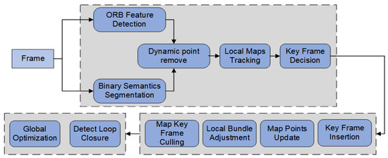 ORB-SLAM2 is an advanced visual SLAM system based on feature tracking that has reliable and excellent performance in most scenarios. There have been related works applying ORB-SLAM2 to 3D reconstruction of internal cavities [31,32] which proved that it can cope with the complex environment of internal cavities. Therefore, this paper implements a global feature-based endoluminal SLAM scheme based on ORB-SLAM2 and improves the robustness and accuracy of the endoluminal SLAM system by adding a decision module that uses semantic information to distinguish surgical instruments, segmenting dynamic features and removing them as outliers. A brief framework of the system proposed in this paper is plotted in Figure 3.