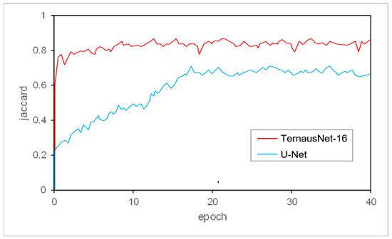U-Net achieves excellent performance in different biomedical segmentation applications and is a very classical network. The validation learning curve of the TernausNet-16 network versus the original U-Net network is represented in Figure 4. The TernausNet-16 network model converges to a stable value much faster than the original U-Net. The final steady-state result of TernausNet-16 is also higher than that of the U-Net, which means that the improved segmentation framework performs better segmentation of surgical instruments with higher accuracy compared to the original U-Net network.
