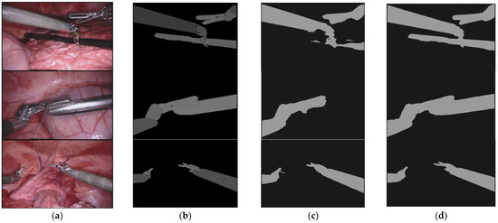 Comparison of semantic segmentation results for surgical instruments. (a) The original image; (b) The ground truth; (c) U-Net-based segmentation; (d) TernausNet-16-based segmentation.