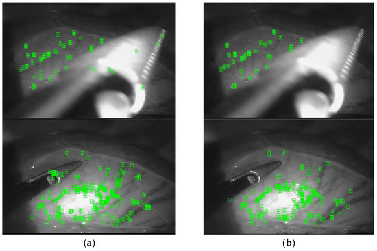 For each input frame containing surgical instruments, a mask is obtained by binary semantic segmentation calculation. The features obtained by the ORB feature extraction algorithm in the SLAM system are removed from the feature sequence when they are located in the mask region, while the features in other regions continue to be used for subsequent tracking and mapping. By using the mask to limit the feature detection area and thus prevent the feature points from concentrating on the surgical instruments, false extraction and matching can be avoided. As shown in Figure 6, the feature point detection on the surgical instruments is successfully excluded by using the mask.