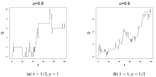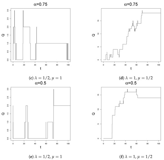 The main feature of the queue is the Markov property, which, on one hand, gives a quite tractable model, while, on the other, it precludes any possibility of including memory effects. To overcome such a problem, one can extend the study to the class of semi-Markov processes, introduced by Lévy in [10]. A special class of semi-Markov processes can be obtained by means of a time change, i.e., the introduction of a non-Markov stochastic clock in the model. This is done, for instance, by composing a parent Markov process with the inverse of a subordinator. In the specific case of the -stable subordinator, one refers to such a new process as a fractional version of the parent one, due to the link between this time-change procedure and fractional calculus, as one can see from [11,12,13,14,15,16,17], to cite some of the several works on the topic. Together with a purely mathematical interest, let us stress that this procedure leads also to some interesting applications (see, for instance, [18] in economics, [19] in computing and [20] in computational neurosciences). In the context of queueing theory, this has been first done in [4], in the case of the queue, and then extended in [21,22] to the case of queues with catastrophes, [23] in the case of Erlang queues and [24] for the queues.