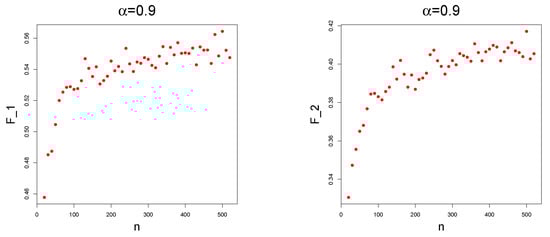 Point plots of (resp. on the right and on the left) against n for , and different values of .