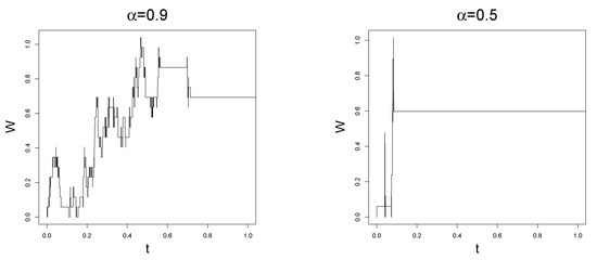 Vice versa, if we are interested in the properties of the Delayed Reflected Brownian Motion, Theorem 7 provides a continuous-time random walk approximation of such a process. This is a quite useful property when combined with the discrete event simulation procedure (which is a generalization of the well-known Gillespie’s algorithm; see [31,63]). Indeed, the simulation of an inverse -stable subordinator is usually done by means of Laplace inversion, if we start from the Laplace transform of , or by inverting the subordinator, which is instead simulated via the Chambers–Mallow–Stuck method [55]. The algorithm presented in the paper does not rely at all on the simulation of the inverse subordinator, thanks to the fact that we are able to simulate Mittag–Leffler random variables by using the Chambers–Mallow–Stuck method.