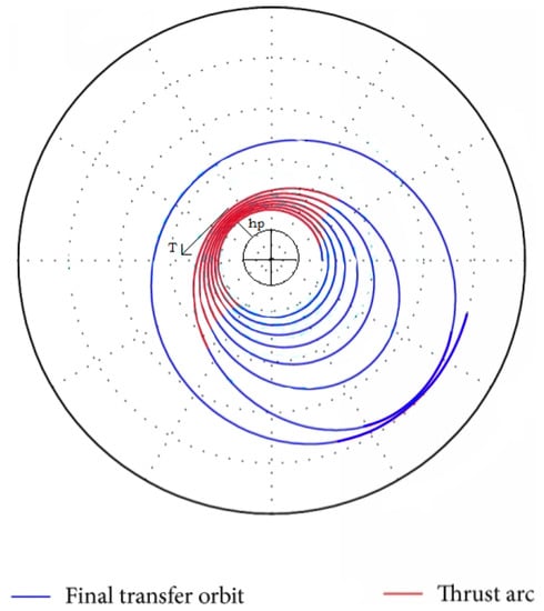 The dynamical system during the ascent is constituted by the spacecraft starting its motion in orbit around the Earth—after being detached from the rocket—in a parking orbit with given orbital elements. After that, the spacecraft is powered by low thrust until it reaches an orbital energy level of zero. The engine operates in an “on-off” mode, with thrust arcs near perigee and coast arcs in the rest of the orbit, as illustrated in Figure 1. A family of transfer orbits is built using the total transfer time as a parameter. This means that, based on its value, optimization techniques are used to determine the number and duration of the thrust arcs.