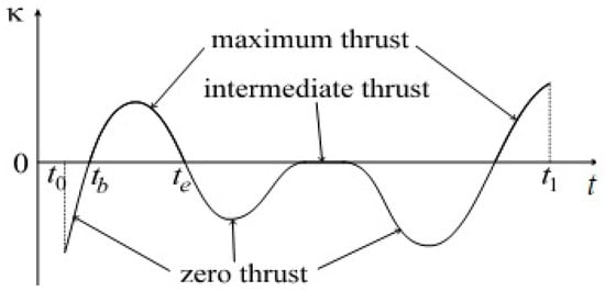 In fact, the intermediate thrust is never used in practice. Thus, the optimal CEV transfer trajectory consists of thrust arcs with maximal thrust () and coast arcs with no thrust (). As is well known, if the thrust is impulsive, the optimal impulses are located in the perigee for the ascent in the Earth’s—or other planet’s—SOI. So, in the case of electric propulsion, the thrust arcs are located at the perigee of each trajectory. The problem is to determine the optimal positions of the thrust arcs with respect to the perigee and their optimal lengths. For non-circular orbits, the further the thrust application is from the perigee, the less effective is the thrust, compared to the application at perigee. Due to this fact, if and are the characteristic velocities necessary for the transfer between two given orbits by means of impulsive and low thrust, respectively, then . The value is the so-called gravity loss.