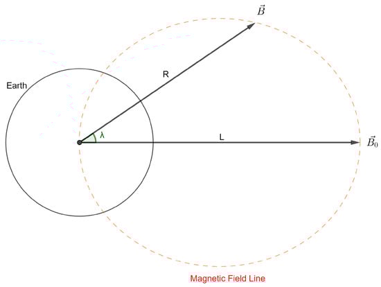 where is the radial distance in which the field line crosses the magnetic equator, and is the Earth’s equatorial radius, 6378 km. Therefore, the value of L indicates the point at which a specific field line crosses the magnetic equator, measured in Earth radii, as illustrated in Figure 4.
