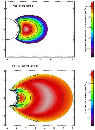 Figure 6 presents the contour maps made for the proton and electron belts, in which the omnidirectional integral fluxes of protons are mapped, in particles/(cm s), for each point of space.