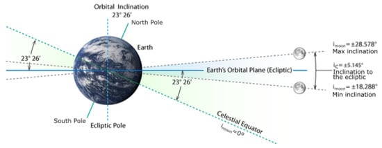 The inclination of the Moon with respect to the ecliptic is the constant [15]. Figure 8 illustrates this angle, together with the inclination of the lunar orbit with respect to the Earth’s equator, which will be hereafter denoted as .
