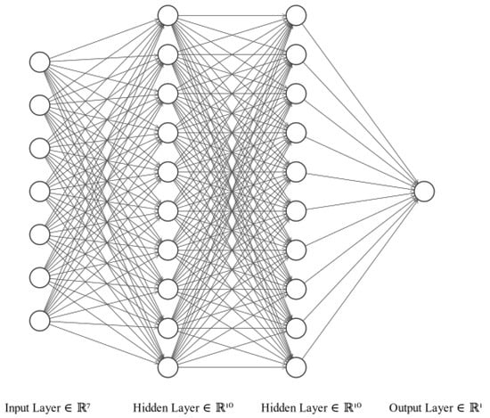 Going into detail, the artificial neural network (ANN) itself is an ML algorithm that is capable of approximating smooth functions to a regression using adequate neurons and layers. As suggested by the name, several neurons are linked in a network, as illustrated in Figure 9. Each of them is called a node, which acts upon the next set of neurons, called a layer. The input layer comprises our input data of x variables (, e, T, , , t, m), whereas the output layer is a single y variable ( or ). Scalar gains, , are placed between each neuron output and neuron input, which are optimized by the algorithm after providing the training data (input x and output y for supervised learning) and minimizing the cost function defined as the mean square error (MSE):