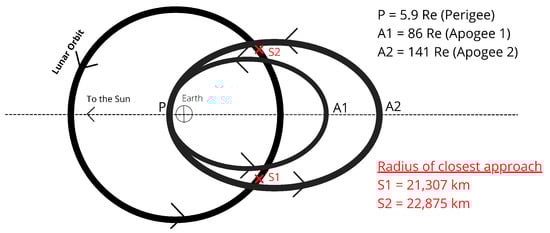 where a is the semi-major axis of the spacecraft’s orbit as it passes the moon and is the distance between the center of the inertial frame (Earth) and the point where the spacecraft meets when it intersects with the moon.