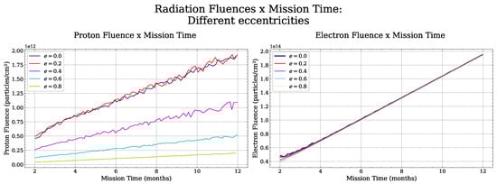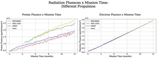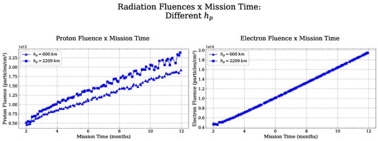 Fluence of protons and electrons as a function of mission time, considering a non-inclined orbit with initial perigee height of 600 km and a propulsion system with and .