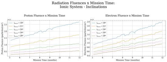 Using the results discussed above, the radiation belt models were then used, together with an extensive program for low-thrust transfer orbit optimization, described in [11]. This initial optimization of the trajectory was used to obtain the fluences of protons and electrons as a function of the mission time, considering a non-inclined orbit with respect to the final orbit flying by the Moon [12]. An example is illustrated in Figure 7.
