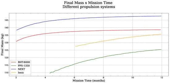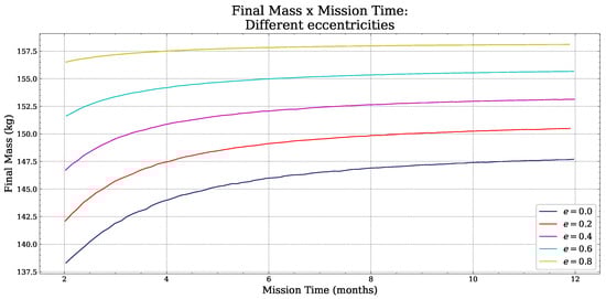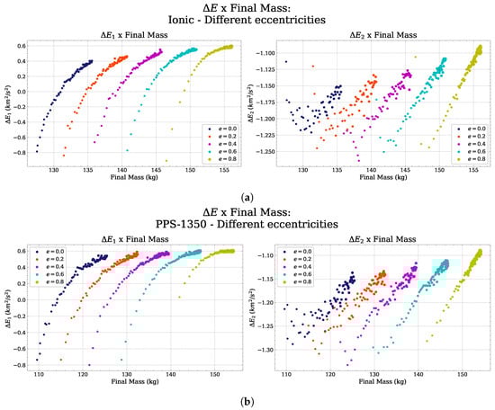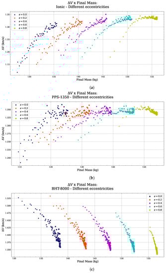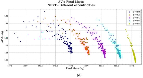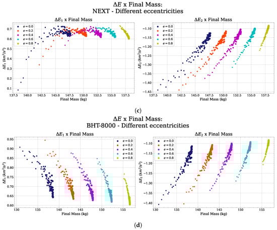 In Figure 31a–d, it is evident that an increase in eccentricity corresponds to higher final masses. In addition, the trend already shown in the graphs in Figure 30 can be seen: for the gain in energy, the ionic and PPS-1350 propulsion systems show an increase in the with the increase in mass, whereas BHT-8000 and NEXT show a reduction in with such an increase.