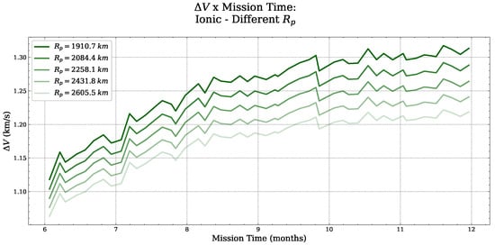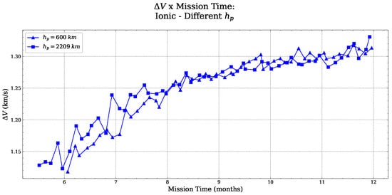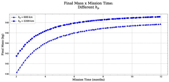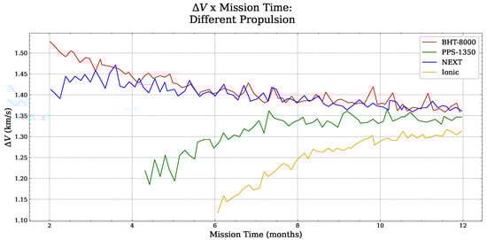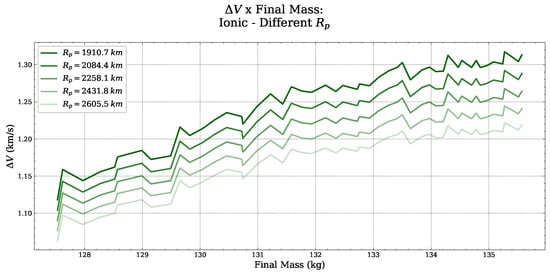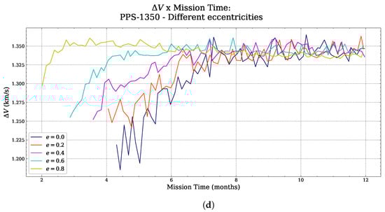 From Figure 32a–d, it is possible to draw more conclusions about the effect of perigee height depending on the propulsion system. For the ionic and PPS-1350 systems, for example, Figure 32a,b make it clear that an increase in the initial corresponds to a greater final mass, as we had already seen, but also at a greater speed gain. For the BHT-8000 system, in turn, it is clear that the increase in corresponds to an increase in the . As for the NEXT system, the curves are very similar to the BHT-8000, but the reduction in with the increase in is not so explicit.