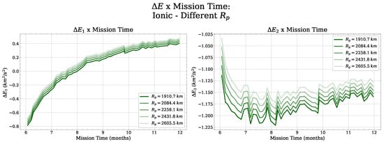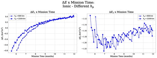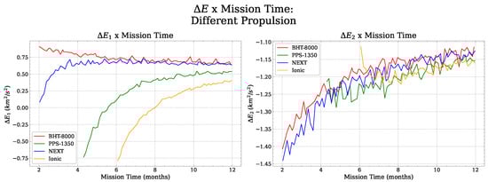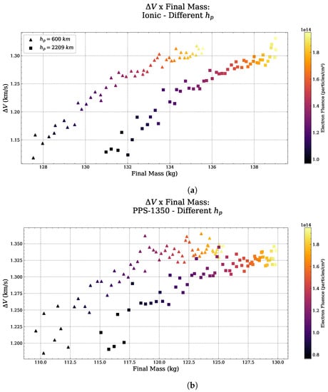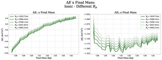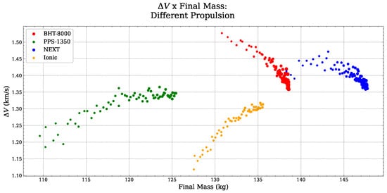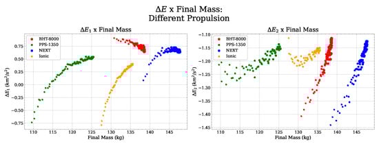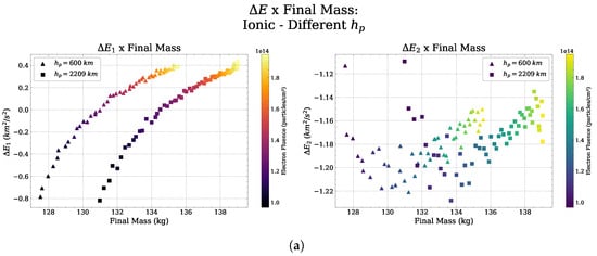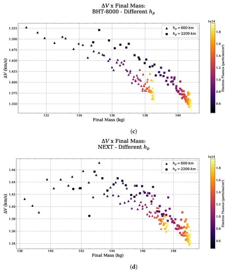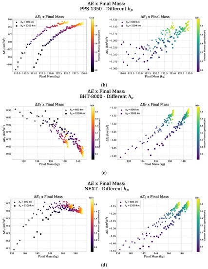 From Figure 28a–d, it is possible to draw more conclusions about the effect of perigee height depending on the propulsion system. For the ionic and PPS-1350 systems, for example, Figure 28a,b make it clear that an increase in the initial corresponds to a greater final mass, as we had already seen, but also at a smaller energy gain. For the energy loss, however, no trend is clear for these two drive systems. For the systems NEXT and BHT-8000, in turn, it can be seen in Figure 28c,d that the increase in corresponds to an increase in energy loss (module of ), whereas nothing can be said about its effect on .