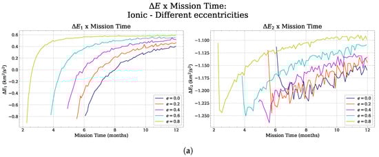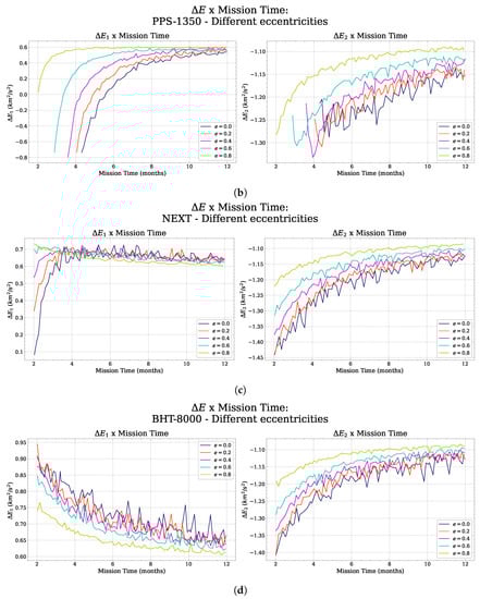 Through Figure 27a–d, it is evident that an increase in eccentricity corresponds to greater final masses. In addition, the trend already shown in the graphs in Figure 26 can be seen: for energy gain, the ionic and PPS-1350 propulsion systems show an increase in with the increase in mass, whereas BHT-8000 shows a reduction in with such an increase and NEXT shows both mentioned trends, the first for smaller masses and the second for larger final masses. As for the energy loss , the tendency of the four thrusters is to reduce the loss with the increase in the final mass.