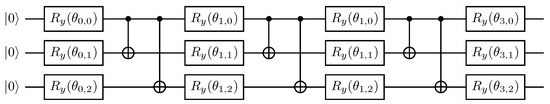 where is an initial wave function, m is the number of qubits, is a Y rotation of an angle applied to qubit i, is a gate acting on qubits , and r is an integer denoting the number of times an entangling gate E followed by a layer of Y rotations is repeated. The ansatz is illustrated in Figure 4 for .