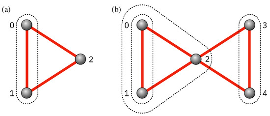 Representation of a set of three (a) and five (b) spins on graphs with triangle connectivity. Black circles represent spins, labeled from 0 to 4, and red lines connect neighboring qubits. Black dashes lines represent subsets (in panel (a)) and , , (in panel (b)).