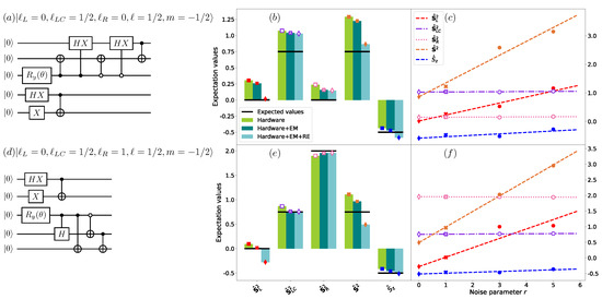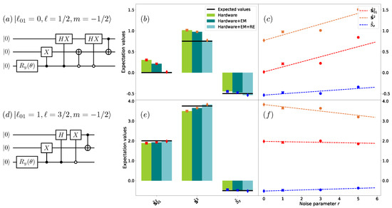 Results from the exact recursive construction, for systems of spins prepared in the wave functions and ((a–f), respectively) on the ibmq_athens device. (a,d): Quantum circuits to encode the target states. (b,e): Expectation values of the total spin operators , , and from raw hardware simulations (light green, leftmost bar), simulations employing readout error mitigation (EM, teal, center bar), and simulations employing readout error mitigation and Richardson extrapolation (EM + RE, light blue, rightmost bar). Exact values are marked by black lines. (c,f): Extrapolation of the expectation values in the middle panels versus number of CNOT gates. Crosses (r = 1), circles (r = 3.5), and diamonds (r = 0) denote error-mitigated, noise-amplified, and extrapolated quantities, respectively. Red, yellow, and blue symbols indicate , , and , respectively.