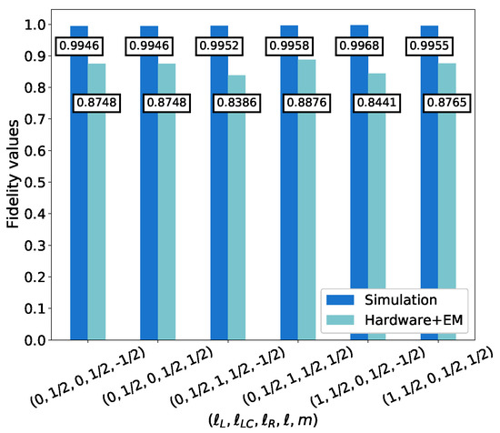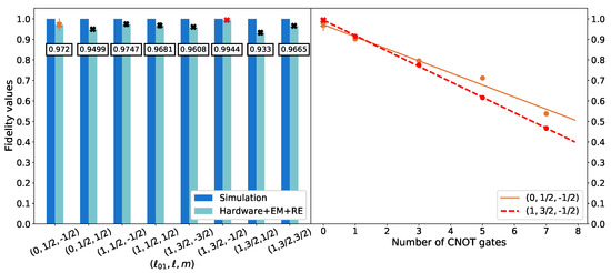 To address these questions, in Table 1 we compute the fidelity and purity of the state , respectively, Equations (18) and (19). We observe , which mirrors the deviations between exact and simulated expectation values of spin operators. Furthermore, in raw hardware simulations, indicates that qubits are depolarized by decoherence. The combined use of EM + RE increases the fidelity towards one, indicating a more faithful representation of the quantities measured on the device. Fidelities are extrapolated as shown in the right panel of Figure 8, where analogous results are presented for all the total spin eigenfunctions of qubits.