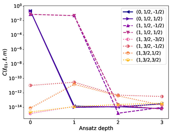 In Figure 11, we show the optimized cost function for the ansatz with qubits and the connectivity in Figure 4, as a function of the ansatz depth r, as defined in Equation (11). As seen, the choice ensures minimization of the cost function within single numeric precision across all spin eigenstates. In Table 2, we list the fidelity between the state and the target eigenstate . As seen, the fidelity is equal to 1 except for the Dicke states [69,70,71,72,73]. This is not unexpected, as the Dicke states are the most entangled n-spin states and, therefore, the most difficult targets for a variational optimization.