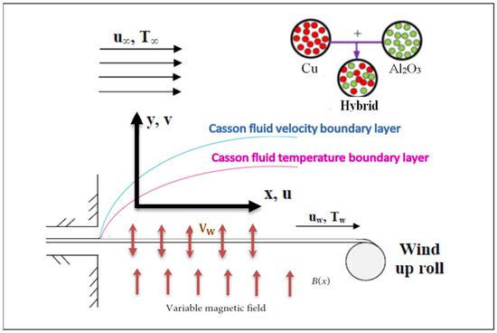 where is the stress tensor and is the plastic dynamic viscosity of the non-Newtonian fluid. , and is the component of the deformation rate. is the product of the component of deformation rate with itself. is a critical value of this product based on the non-Newtonian model, and is the yield stress of the slurry fluid. However, consider the magneto-flow of Casson hybrid nanofluid over a horizontal surface, moving with uniform velocity Uw parallel to the uniform free-stream velocity U∞ with massive fluid suction, which is imposed at the surface. The flow model and physical co-ordinate system is exhibited in Figure 1. In this co-ordinate framework, the x-direction extends parallel to the surface, whilst the 𝑦-direction extends upwards perpendicular to the surface. A variable magnetic field strength B(x) is applied vertically to the flow. The temperature surface is deemed to have a constant Tw, whilst the ambient temperature has a constant T∞. The hybrid nanofluid used in this model is composed of uniquely manufactured alumina (Al2O3) alloy nanoparticles and copper (Cu) nanoparticles suspended in water (base fluid). The physiothermal properties of hybrid nanoparticles and base fluid are shown in Table 1. Simultaneous solutions are deployed for Casson hybrid nanoliquid, and both viscous dissipation and Joule heating effects with great suction are taken into consideration. Under the above assumptions, modeling of this study can be given as (see [2,9]):